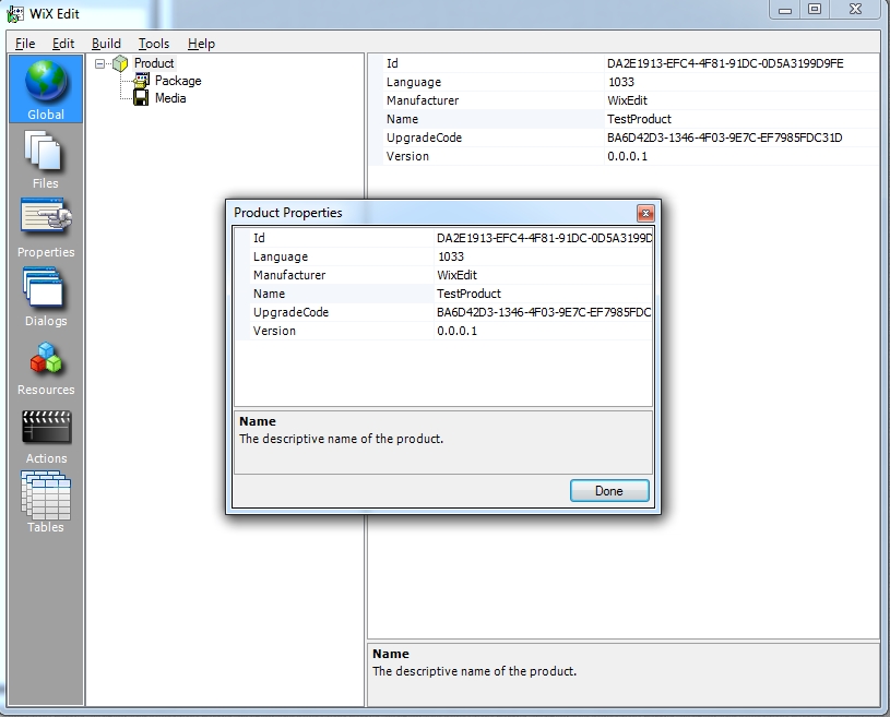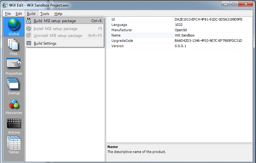 We have created our first project. The Global tab allows you to see Product information such as name and how it is packaged and the Files tab shows you the directory and the files that we added with the wizard.