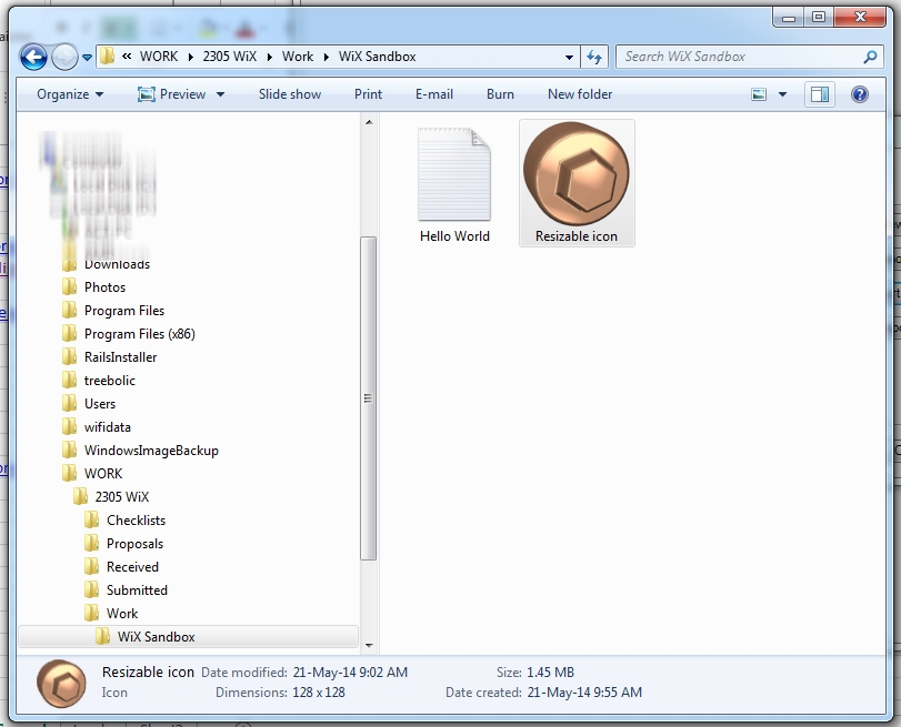 Create a sample directory in Explorer. I named mine WiX Sandbox and I copied an icon and a text file. These are the files that I would like to install into a directory of the same name on the target computer.