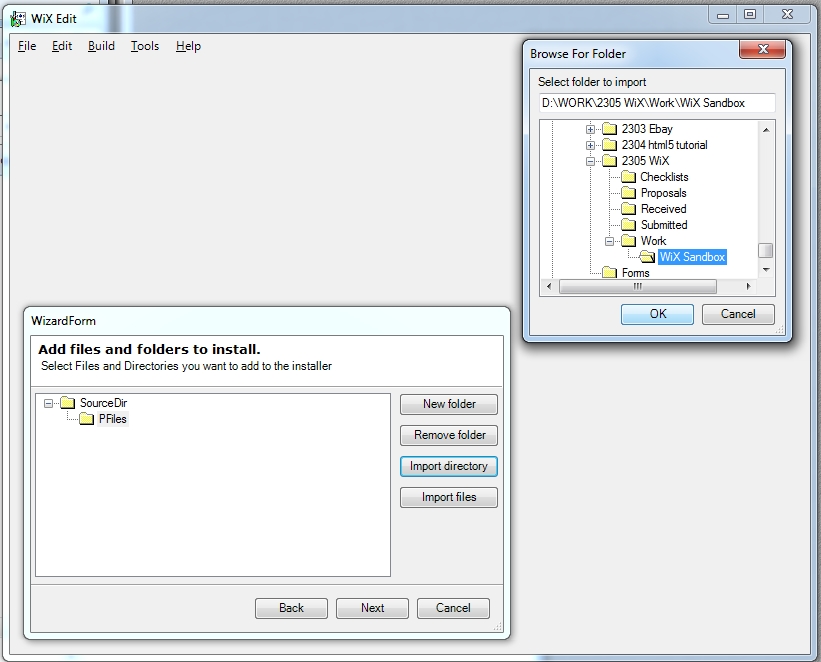 Be sure that you click on the PFile directory before you click Import. You are choosing the folder that will be copied to the Program Files directory on install. Navigate to the sample directory and choose it.
